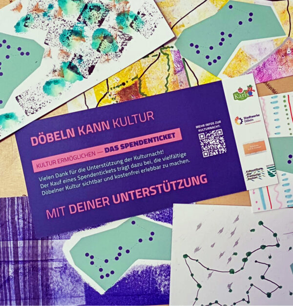 Die Döbelner Kulturnacht soll auch in diesem Jahr eintrittfrei bleiben. Diese Entscheidung wurde gefällt trotz gestiegener Veranstaltungsnebenkosten. Um das umzusetzen wird es in diesem Jahr erstmals ein freiwilliges „Spendenticket“ geben. Individuell gestaltete Kunstwerke im DIN Lang Format sind dafür für einen Mindestbetrag von 10,00 Euro zu erwerben. Die Schülerinnen du Schüler des hiesigen Lessing-Gymnasiums gestalteten die auf 500 Stück limitierte Auflage. Wer sich eines dieser besonderen kleinen Kunstwerke sichern und gleichzeitig Döbelns Kulturnacht unterstützen möchte, bekommt sein Spendenticket ab sofort in der Döbeln-Information, an der Theaterkasse oder im Onlineshop des Treibhaus e.V.